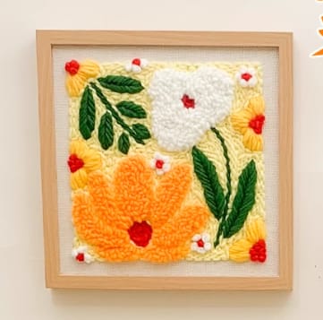 The kit includes an embroidery canvas, a punch needle, and skeins of embroidery wool.